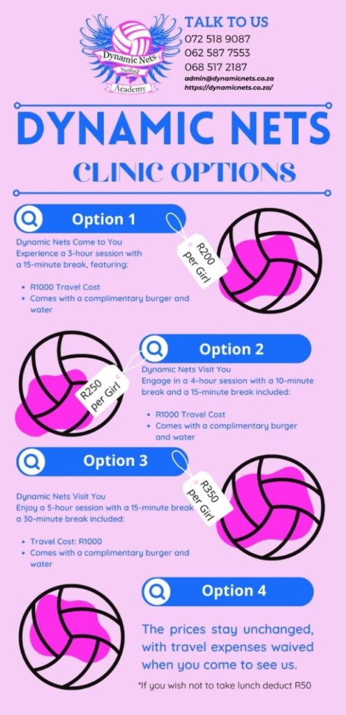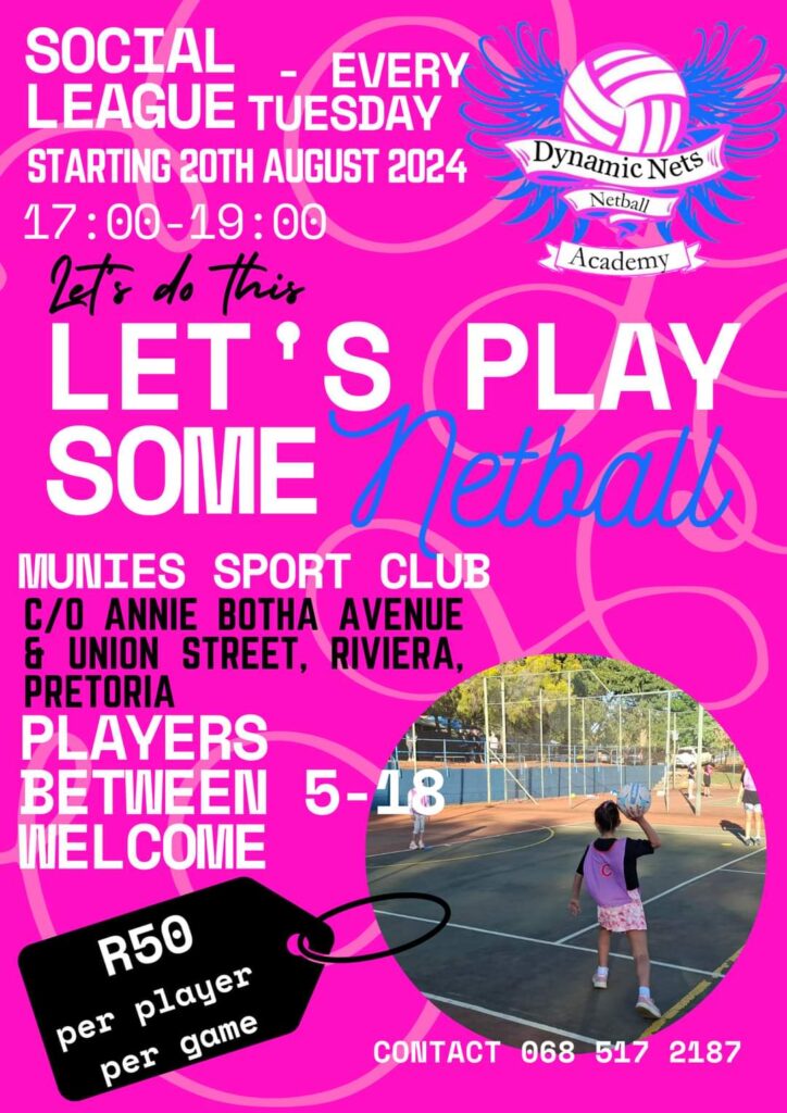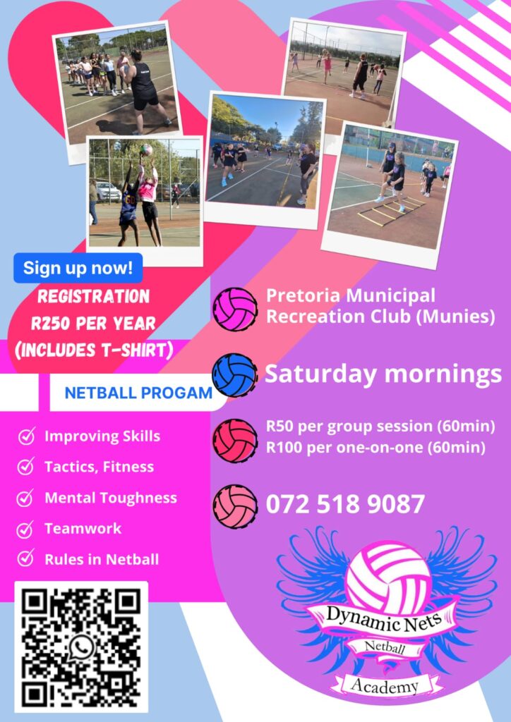 Welcome to Dynamic Nets Netball Academy! Located in Villieria, Pretoria, our academy offers premier netball coaching for children and teens aged 5 to 19. Our team of four qualified Level 1 NSA netball coaches is dedicated to fostering skill development, teamwork, and a love for the game in a supportive and fun environment. Whether your child is a beginner or an aspiring professional, Dynamic Nets Netball Academy provides personalized training to help them achieve their full potential on and off the court. Join us to experience top-tier coaching and a vibrant netball community.